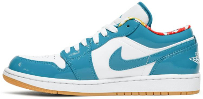 This offering of the 1 Low features a white leather base with light teal patent leather overlays. Additional details include signature Swoosh logos at sides and white stitched Wings logo at counters. The sock liner features the Barcelona motif with red . yellow . blue and white tones. Gum rubber soles top off this iteration of the A1 Low.