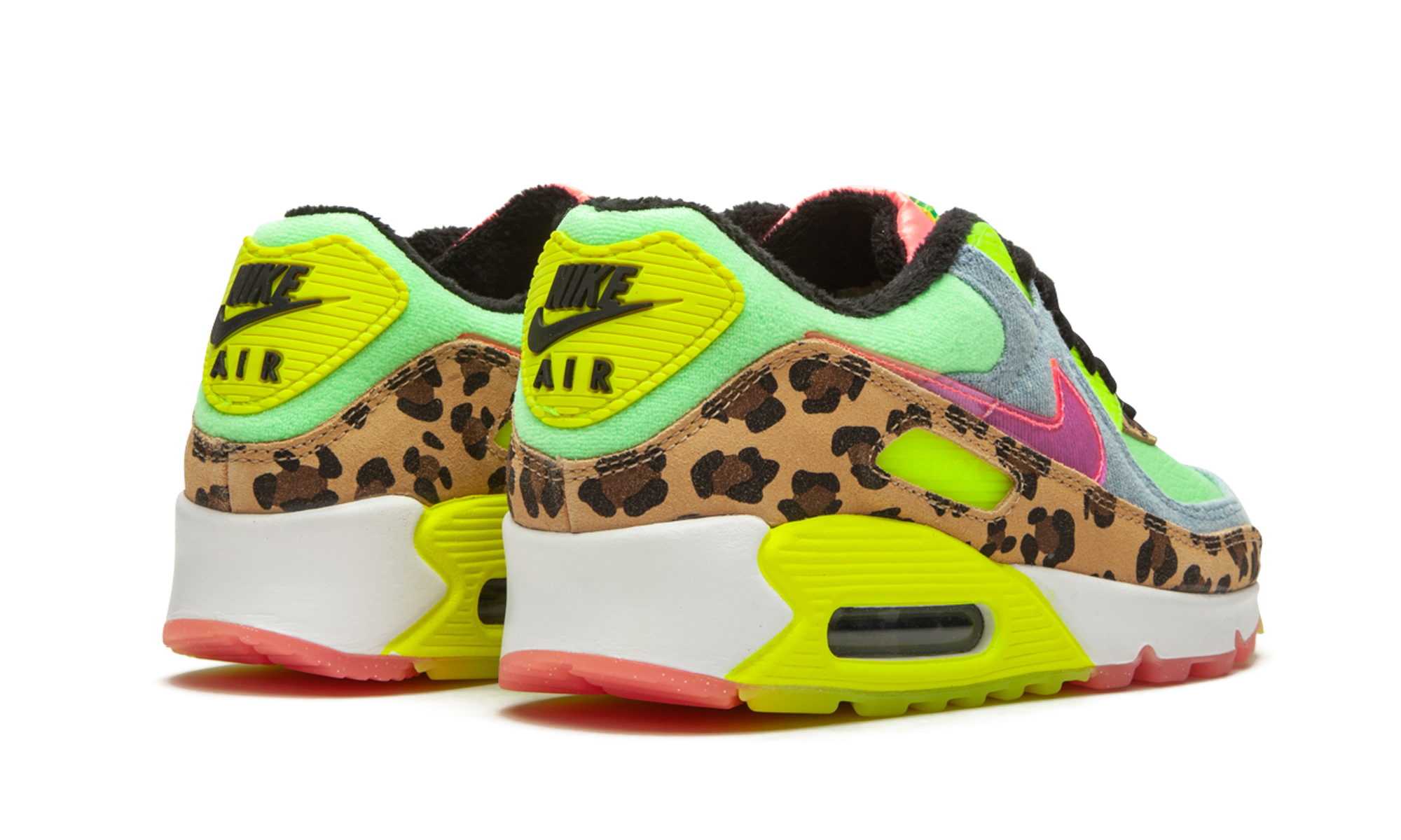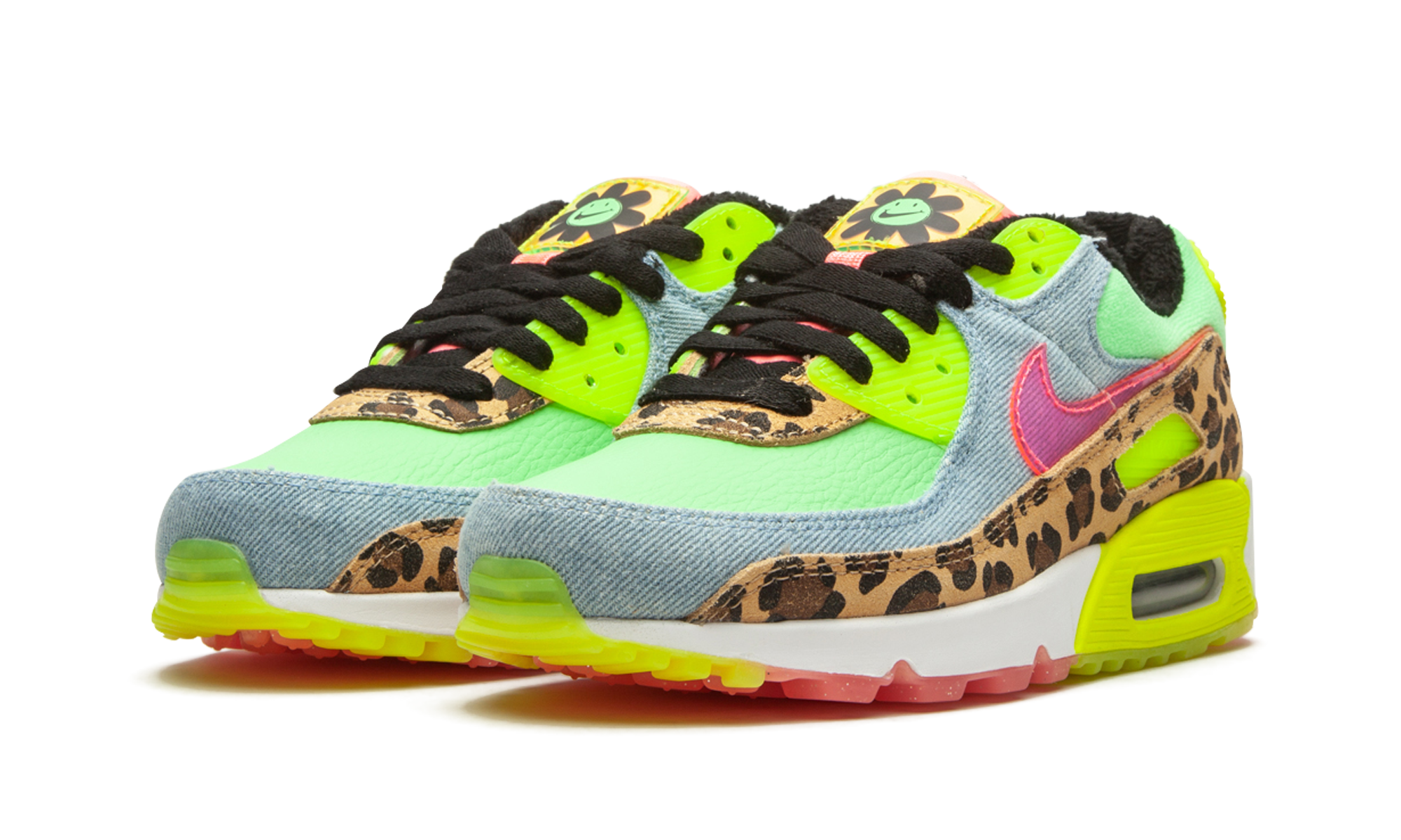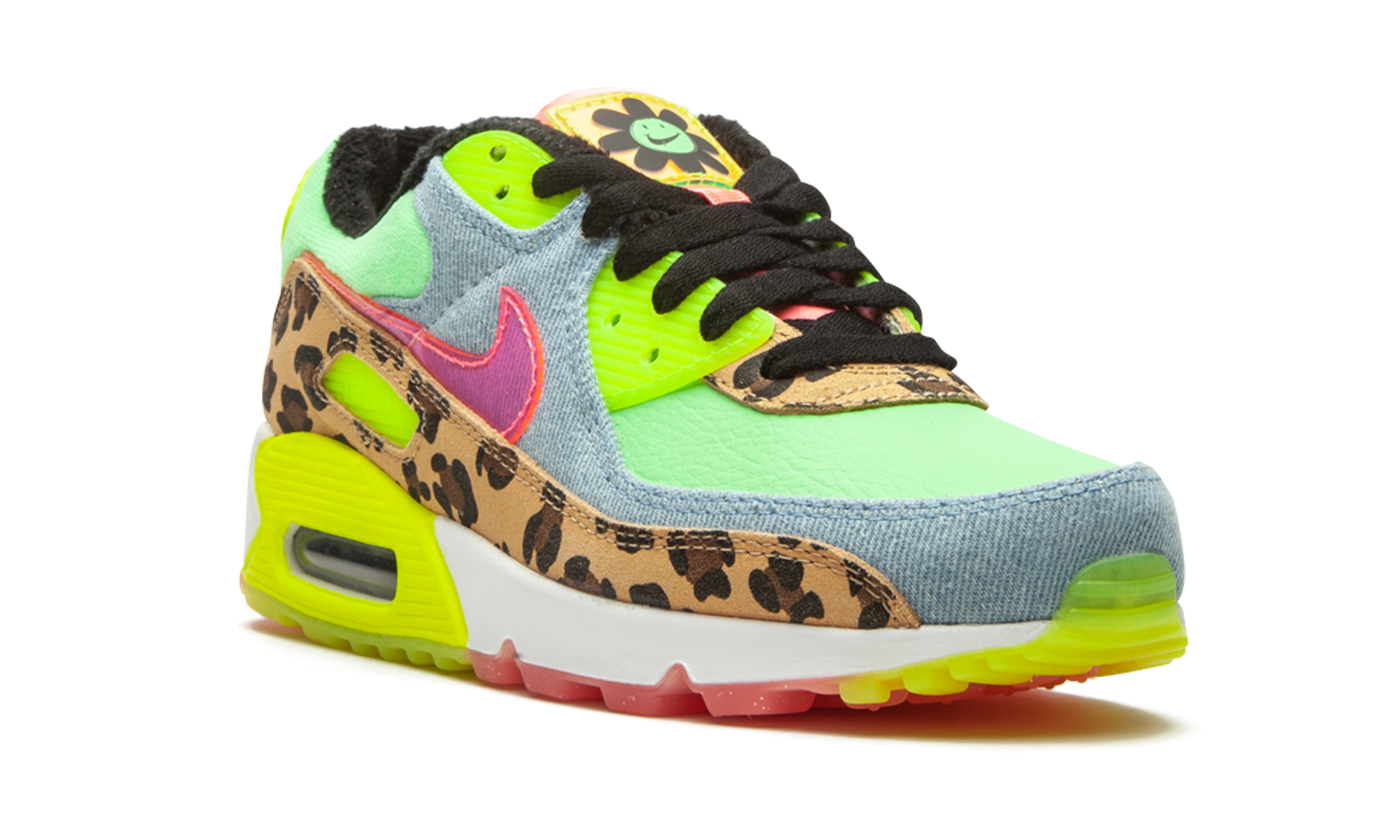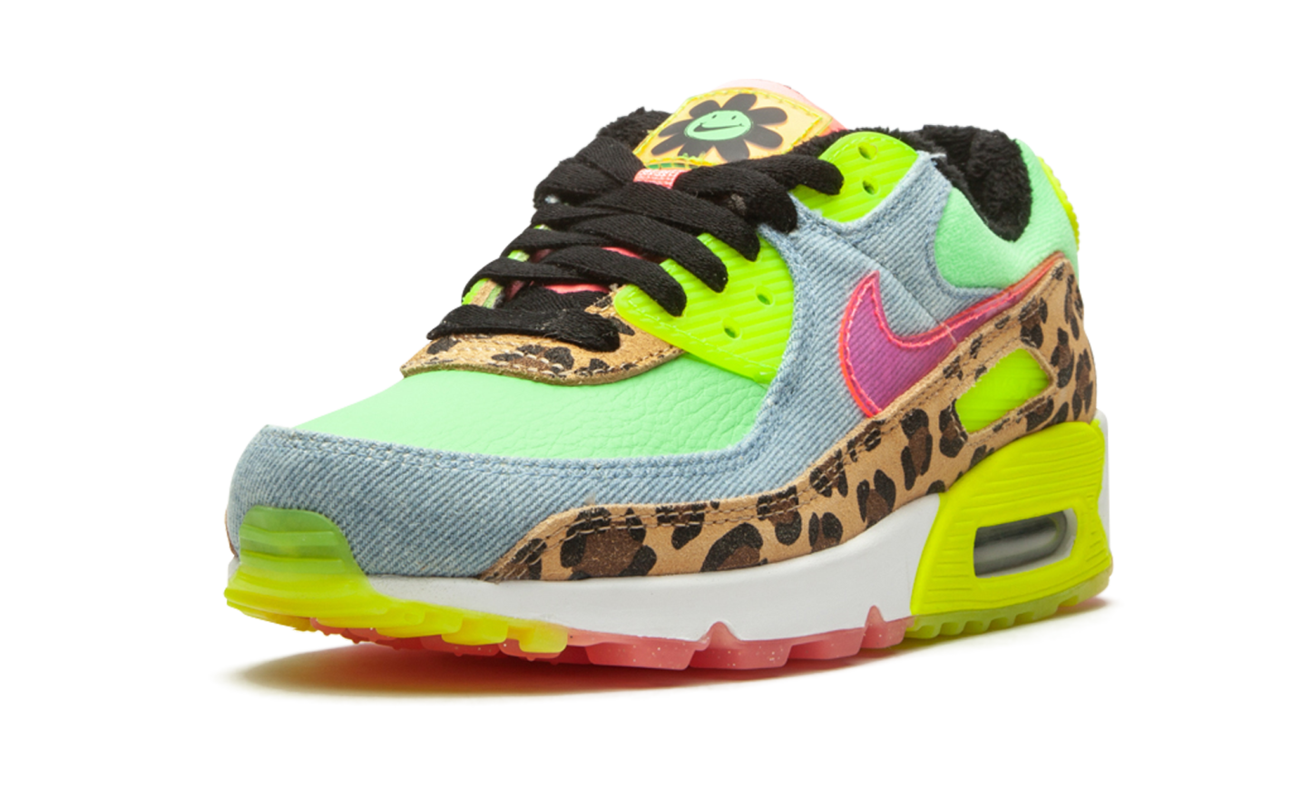 The Women’s Nike Air Max 90 LX “Denim Leopard Print” is a wild colorway of the retro performance running shoe that blends contrasting colors and materials to tell its story. Released by Nike to honor the Air Max 90’s 30-year anniversary, the “Denim Leopard Print” is certainly one of the more unique looks ever for the stately low-top shoe. Calling to mind ‘90s rave culture, a leopard pattern appears on the mudguard and lower eyelets. A washed light denim material can be found on the toe cap, mid-panel, and collar. Nike places a translucent pink Swoosh on the mid-panel for additional party-inspired flavoring. Other details include a Neon “Air Max” branding window and heel tab with black “Nike Air” detailing, a lime green leather base, and smiling floral character on the yellow translucent tongue tag. While the “Denim Leopard Print” is a progression in terms of its use of colors and materials, the model does retain its traditional clear Air unit in the heel. Denim Leopard Print